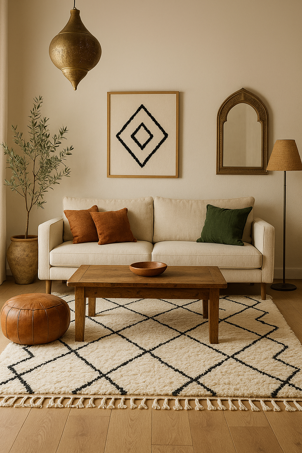 Tip from Tamazirt: Go larger than your sofa — the rug should extend beyond the seating area to visually unify the space.